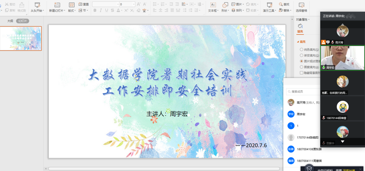 之后开展了对同学们的暑期社会实践的安全培训。今年情况特殊,周老师叮嘱同学们:今年大学生暑期社会实践活动原则上不进行线下集中组队,不开展聚集性实践活动,不开展跨区域实践活动,不在疫情中、高风险地区开展实践活动。以“安全第一、就近就便”为原则,按照个人自主选题、分散实践的方式进行。之后周老师详细讲解了社会实践报告的撰写要求与注意事项,并着重讲述了社会实践过程的安全注意事项。