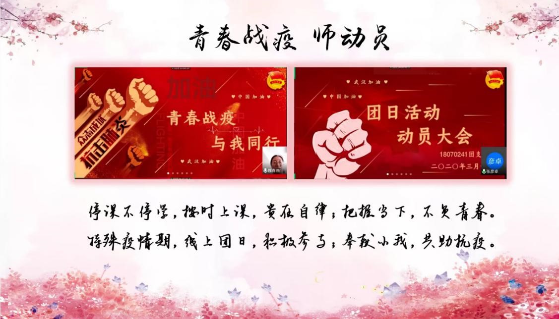 首先是18级各团支部进行答辩,团支部代表们按照抽签顺序依次通过屏幕共享的方式来展示他们在疫情期间举办的各种活动,一个个富有创意,形式新颖的团日活动出现在屏幕上,在令人感叹的同时,也让大家感受到了他们对武汉深深的祝福:虽相隔千里,但你我仍在一起。虽然他们展示的是线上活动,但我们仍然能够看到他们心中对武汉的深切关怀,对前线白衣天使的浓厚敬佩,对所有默默付出的一线英雄们的真挚祝福。