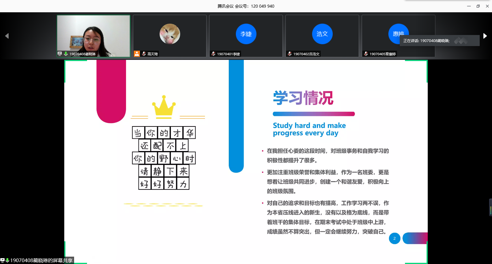 活动伊始,魏老师首先阐述了班级心理委员的职责和角色定位,随后八位心理委员依次进行答辩,他们利用幻灯片展示了自己担任心理联络员(信息员)期间的学习情况、工作业绩、感悟与经验。尤其是在疫情期间,各位心理委员都积极配合学院辅导站,为同学们营造了良好的氛围;之后,贾帅鹏学长谈了他聆听同学们答辩的感受,他认为每位心理委员都有自己的特点,大家认真负责,值得我们相互学习;最后,魏老师对活动进行了点评,她用“言之有物,行之有悟”给与心理委员最高的认可,她希望各位心理委员再接再厉,牢记“初心”,并用“耐心、细心、恒心”去更好的完成班级心理健康工作,使黑料网 此项工作再上新台阶!