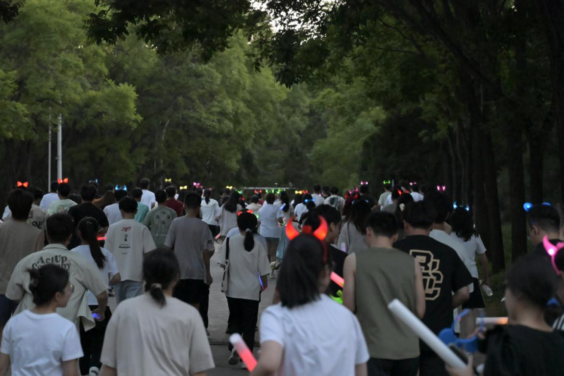 参加夜跑的同学手腕上挂着荧光手环,头上带着荧光发箍,手里握着荧光棒,跑道上变得霓虹斑斓。没有运动会上的你追我赶,多的是大家的并肩前行;没了竞技场上的加油呐喊,多的是朋友间的侃侃而谈。同学们在荧光夜跑中遇见更好的自己,用奔跑的激情和炫彩的荧光挥洒自己的青春轨迹,用动感酷炫和闪闪荧光照亮校园的夜色!