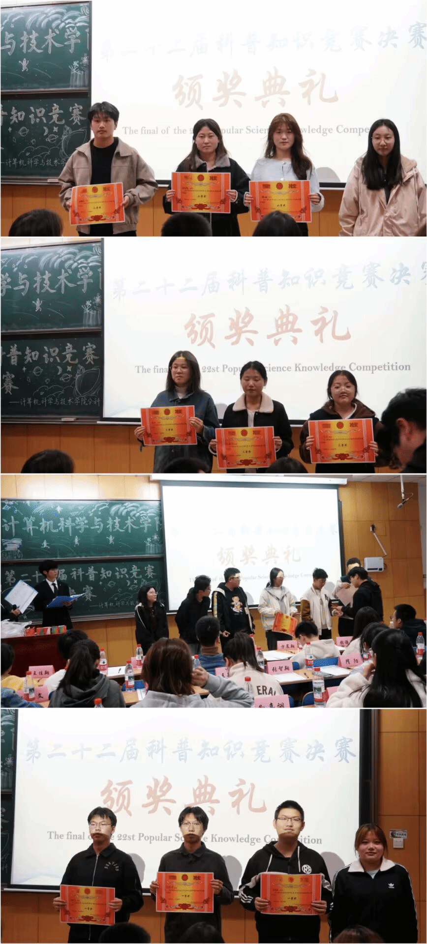 赛事环节丰富多样,设置“闪亮登场”“开门见山”“急中生智”“奋勇争先”“心有灵犀”“巅峰对决”等环节,每一个环节都凝聚着选手们的智慧与汗水。各参赛队伍在展示环节中各显神通,有的以幽默的科技段子引发全场共鸣,有的结合计算机专业特色呈现创意满满的技术展演,充分展现了当代大学生的活力与创意。答题环节中,“开门见山” 的轮流作答考验知识积累;“奋勇争先” 的拨号抢答环节更是紧张刺激。中场 “心有灵犀” 成语竞猜游戏将现场气氛推向高潮;多轮多媒体抽奖互动也让观众深度参与其中,实现了 “选手竞技 + 观众同乐” 的活动效果。竞赛过程中,选手们或沉着思考,或默契配合,将知识储备与临场应变能力发挥得淋漓尽致,现场掌声与欢呼此起彼伏,科学知识的魅力在竞技中得以充分彰显。