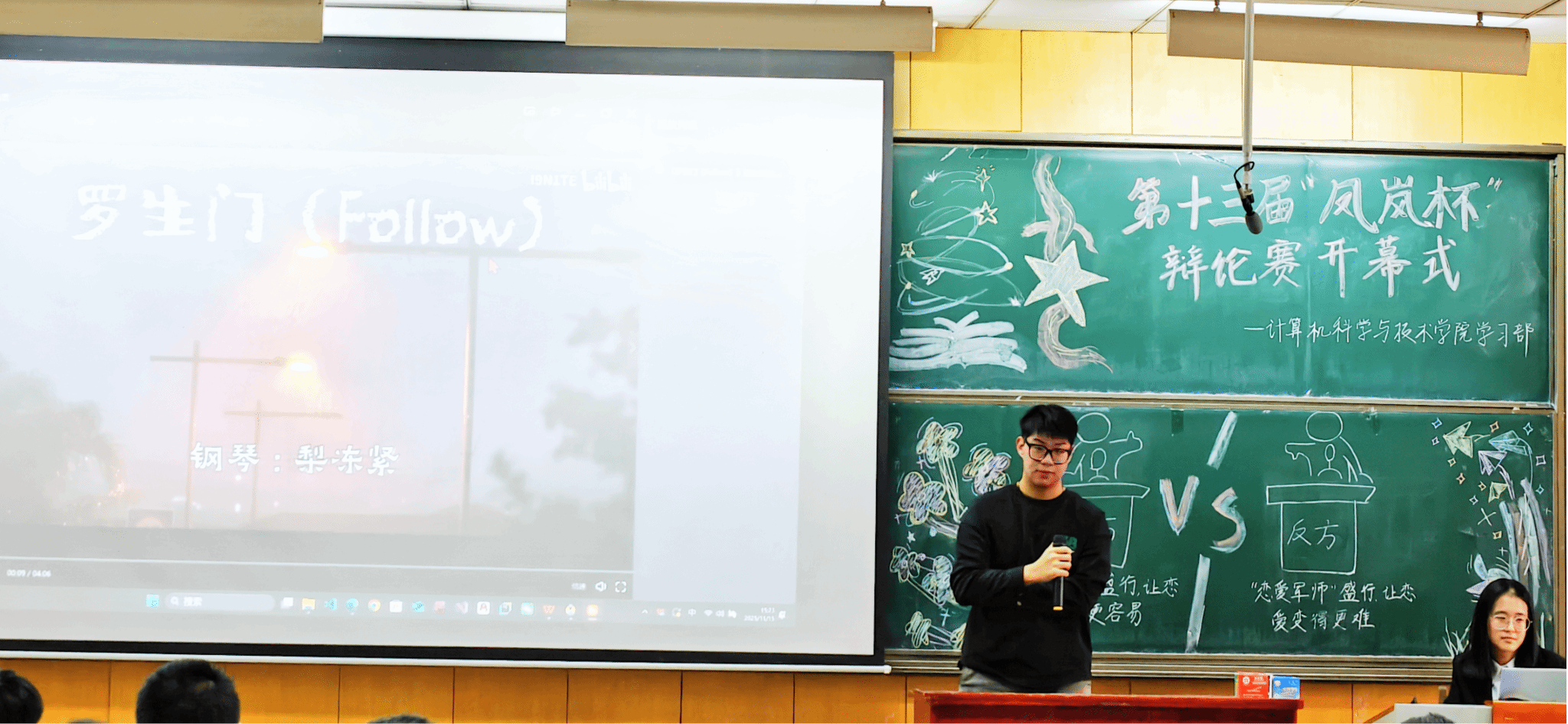汪家琦学长演唱《罗生门》,歌声悦耳动听,之后伴随着热闹的小游戏,辩论赛正式开始!