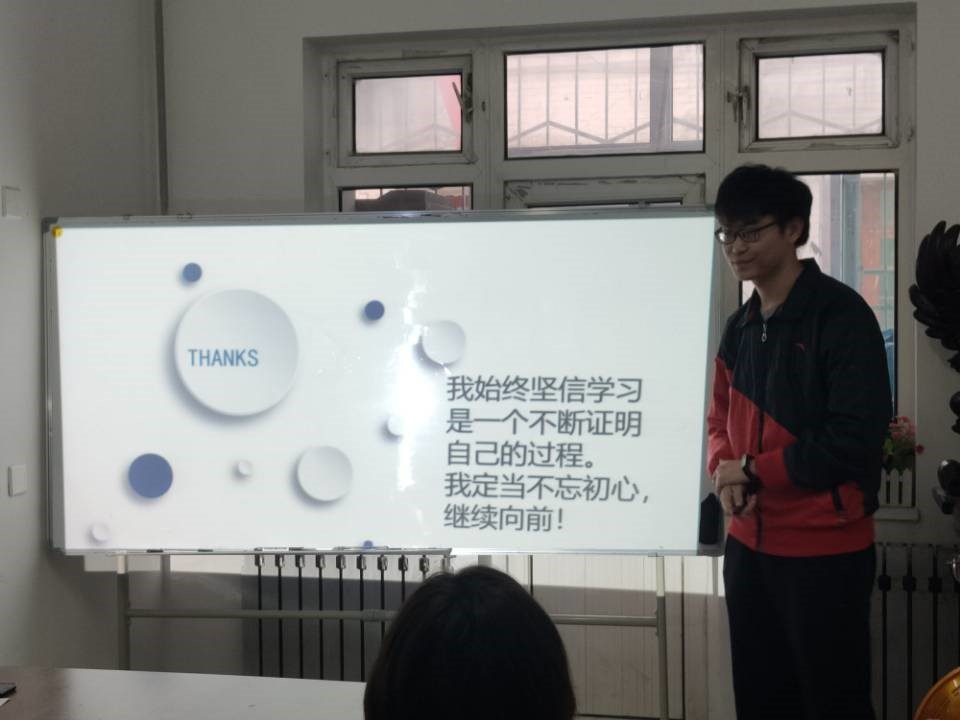 此次答辩共有5人获得参评资格,在主持人介绍了答辩要求和规则后,参加答辩的同学开始了自我展示与现场答辩。每个同学在有规定的时间内分别从学习情况,竞赛活动,创新创业等各个方面展示了自己最出色的一面,整个答辩过程中答辩人员激情澎湃,精彩万分,博得了在座老师与同学的阵阵掌声。