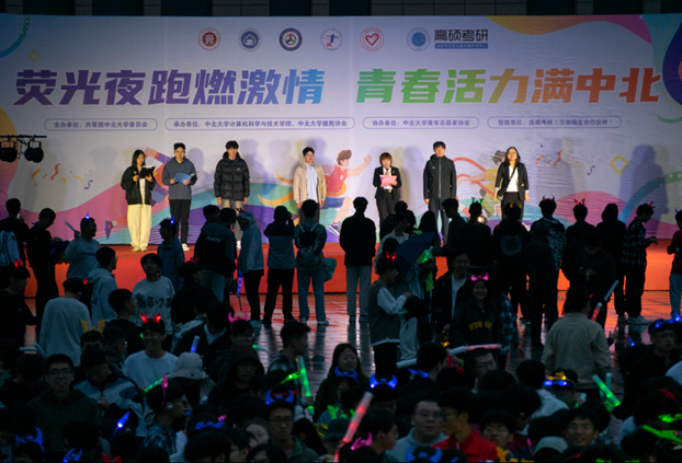 随着发令声响,千余名师生佩戴缤纷荧光装备,汇成一条璀璨流动的光河,涌向校园大道。点点荧光在夜色中跳跃闪烁,与路灯、星光交相辉映,勾勒出青春跃动的壮丽图景。跑道沿途的志愿者加油助威,光影交织间,欢声笑语与奋力奔跑的身影共同构成了中北校园最动人的夜景。